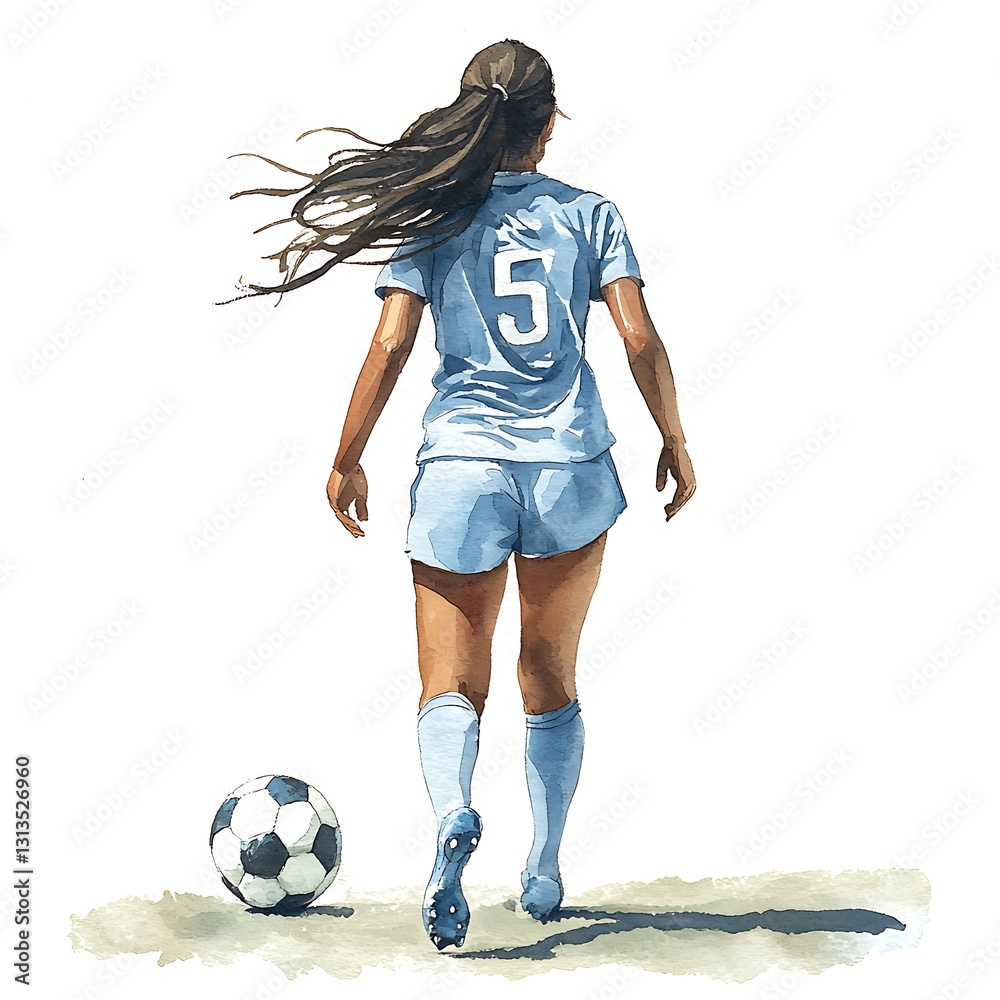 Watercolor Painting of a Female Soccer Player Walking Away from the Camera. A stylish illustration perfect for sports-related projects. #1313526960