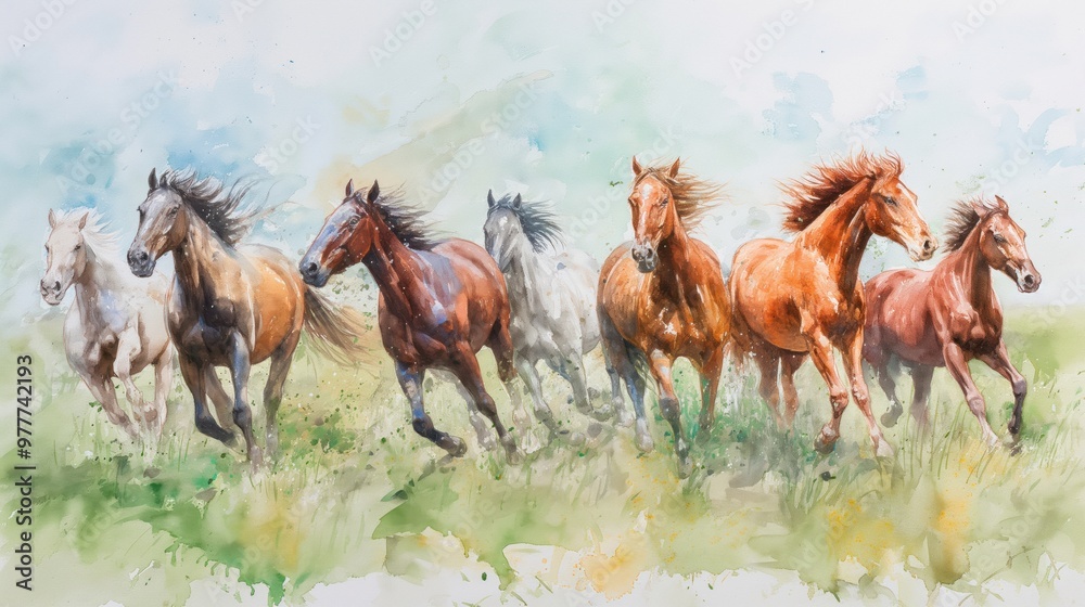 watercolor painting of seven horses run across a field, #977742193