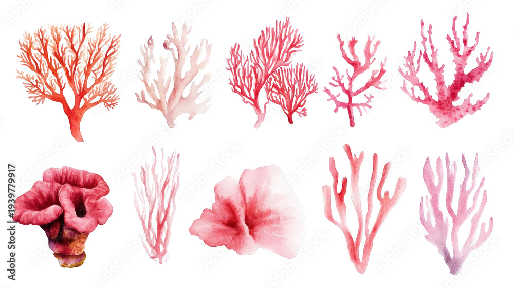 Watercolor pink coral illustrations on transparent background, various coral shapes and seaweed elements, artistic botanical marine collection #1939779917