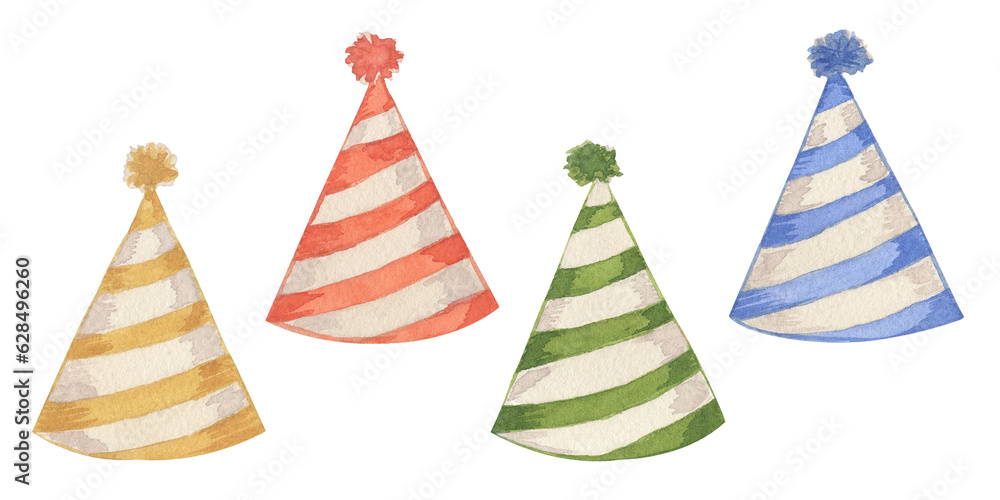 Watercolor set of Birthday party hats. Red, blue, green and yellow party cones. Christmas caps collection in delicate colors. Hand drawn illustration isolated on transparent. #628496260