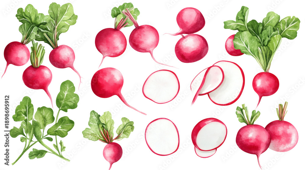 Watercolor set of fresh red radishes with leafy tops and sliced rounds, isolated on black background, botanical illustration for food, cooking, healthy eating, and gardening themes. #1898695912