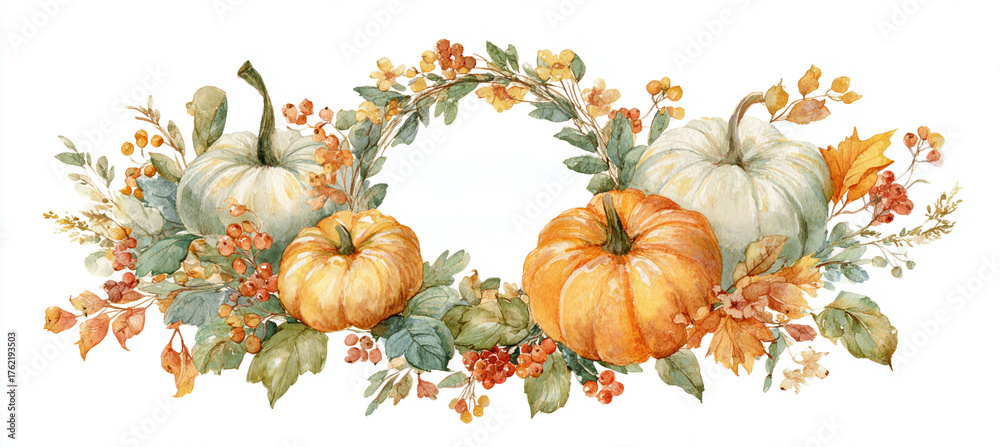 Watercolor Thanksgiving Card with Pumpkin and Autumn Leaf Wreath #1762193503