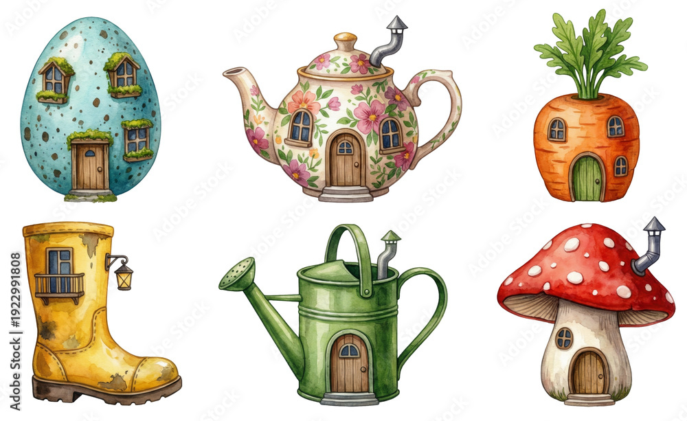 watercolour collection of cute miniature fairy houses shaped like a carrot mushroom and watering can #1922991808
