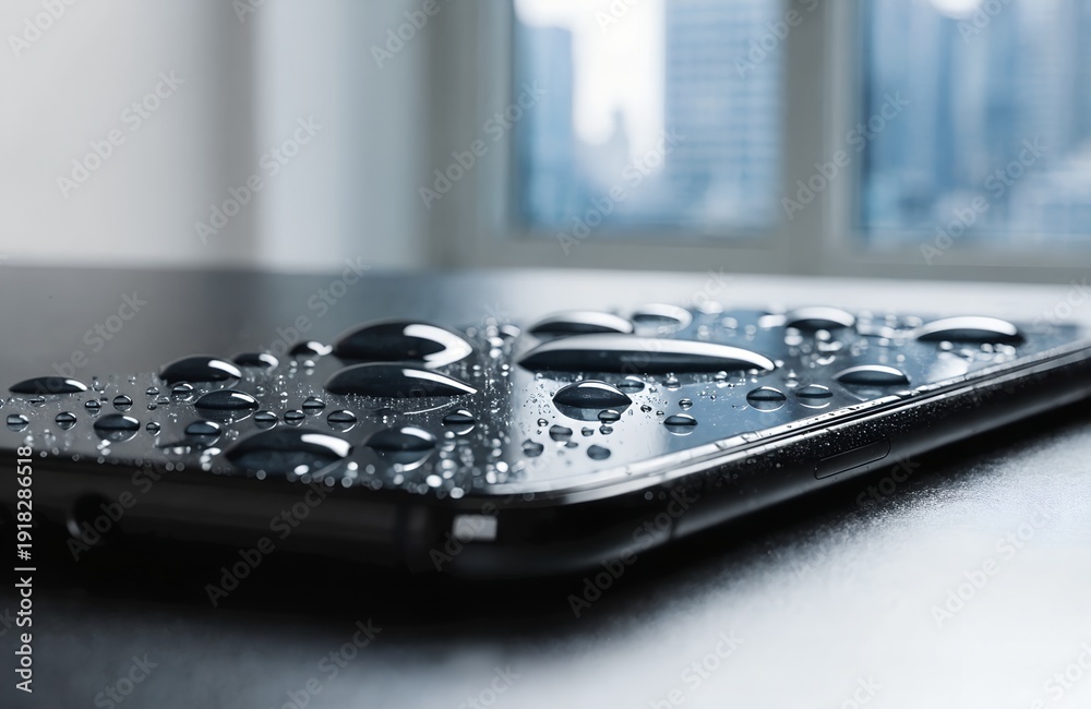 • #1918286518 Waterproof smartphone with water drops on the screen in a modern office.