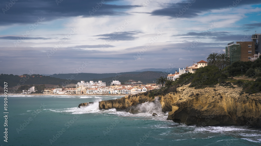 Waves crashing against cliffs in Altafulla on a cloudy day, Catalonia #1909492787