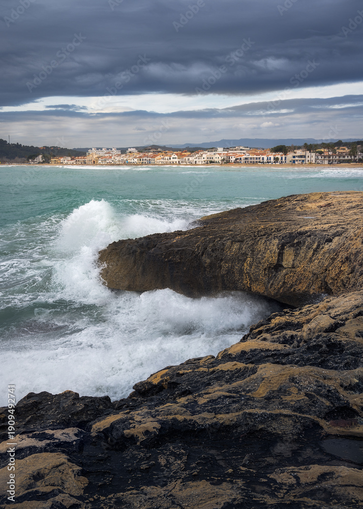 Waves crashing against rocks in Altafulla's serene coastline, Catalonia #1909492741