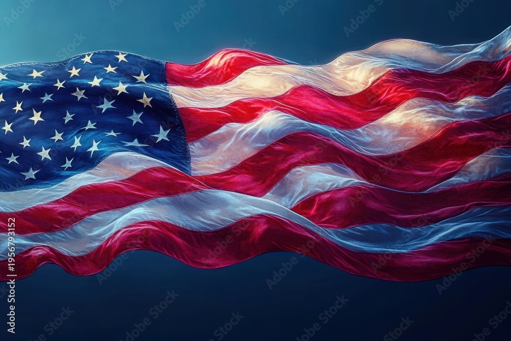 waving red, white, and blue star-spangled flag under dramatic lighting conveying pride and movement #1956793152