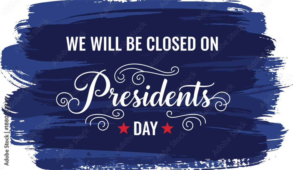 We will be closed Presidents Day sign, patriotic USA notice, red white blue theme, dark background, flat vector illustration #1880582434