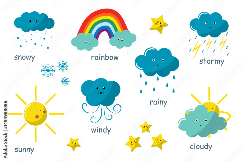 weather cartoon set on a white background. sunny, star, rainbow, windy, cloudy, snowy, stormy. weather character with smile and angry face. Flash cards for preschool, children. Vector illustration #1494988086