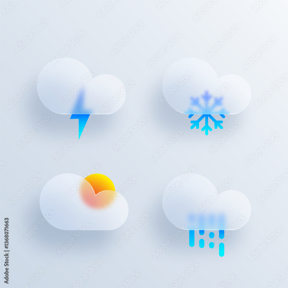 Weather forecast icon set with glassmorphic effect. 3d glassmorphism meteorology elements sign collection. Cloudy, rain, thunderstorm, snow signs. Template design for web or mobile app, ui, ux. Vector #1368071663