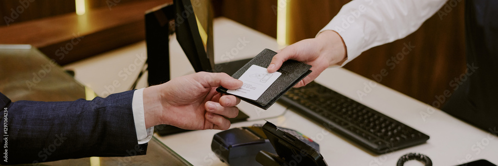 Website banner with unrecognizable delicate female hand giving back passport in black leather cover and key card to hotel resident #1297064234