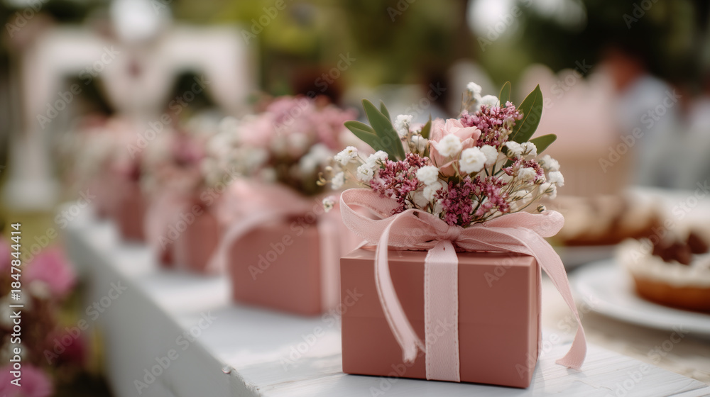 Wedding guest gift setup presentation, heavily defocused celebration background, event favor arrangement, matrimonial reception display, special occasion styling, with copy space #1847844414