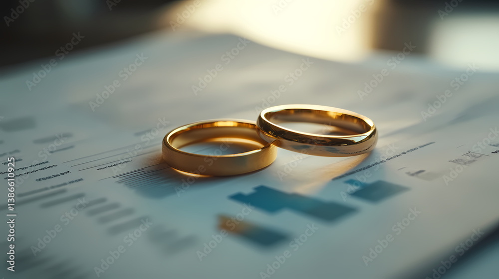 Wedding Rings: A symbolic close-up of two radiant wedding rings placed on a financial document, representing marriage, commitment, and possibly, the complexities of shared assets. #1386610925