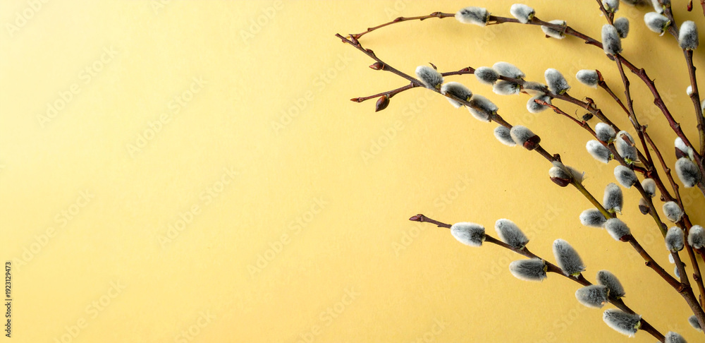 Weeping Willow Blooming Branches Against Soft Yellow Background #1923129473