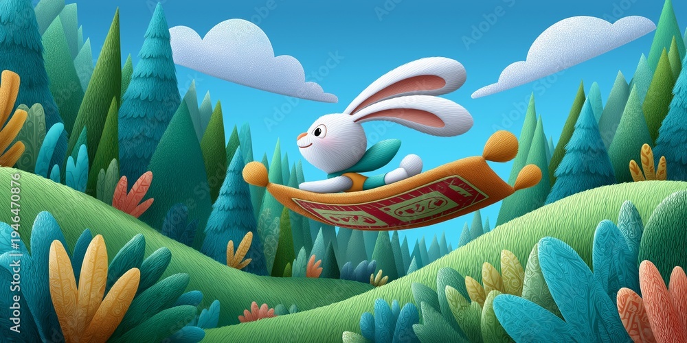 Weißer Hase auf fliegendem Teppich über grünem Grasfeld #1946470876