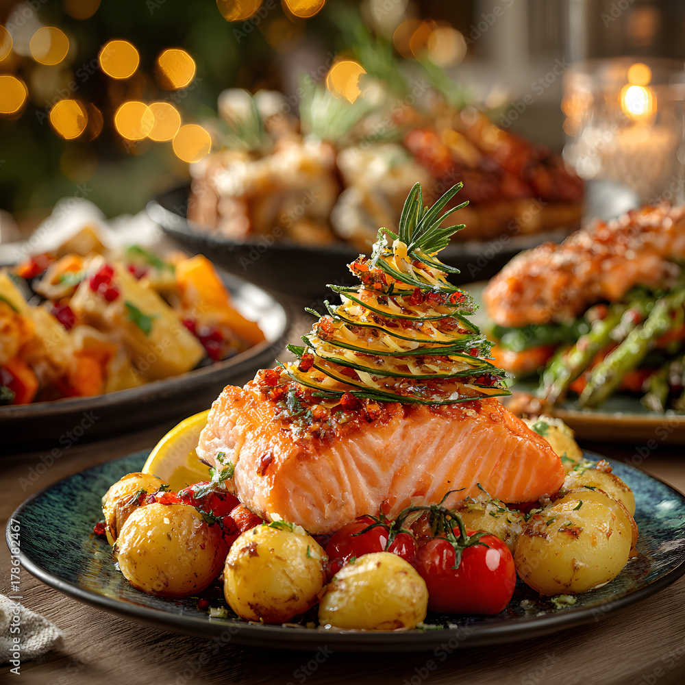 Weihnachtsessen mit Lachs Vorspeise in Tannenform #1786182467