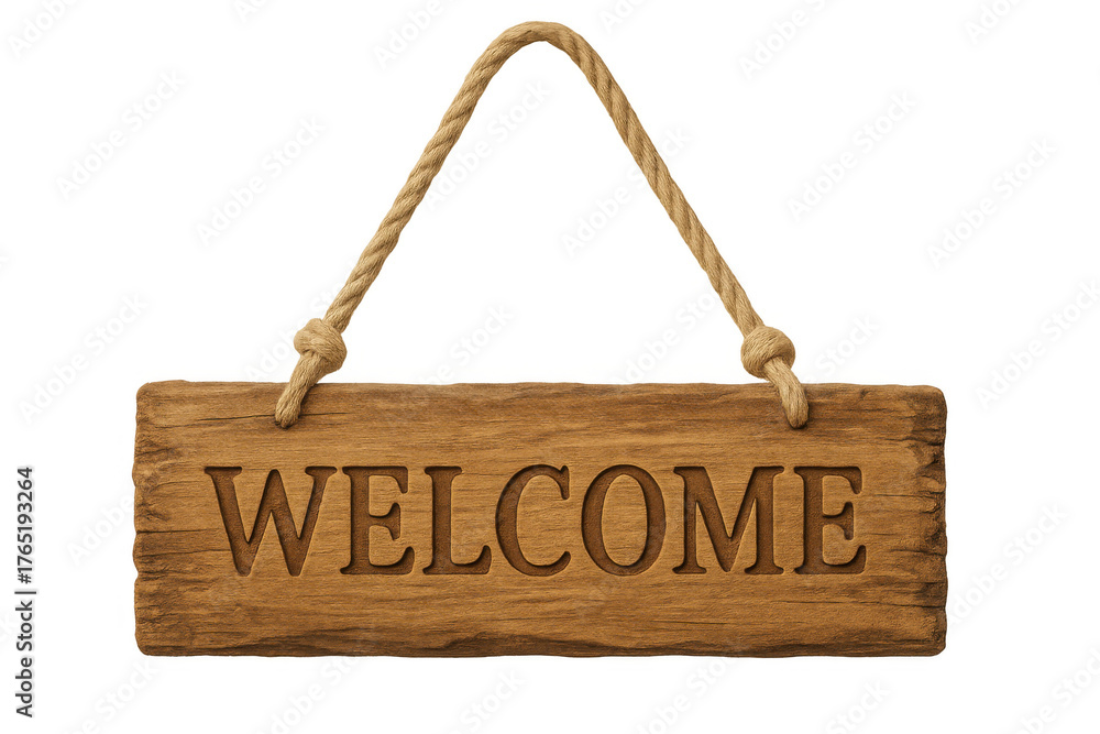 Welcome sign hanging on rope, warm greeting message carved in rustic wooden plank, indicating hospitality and entrance #1765193264