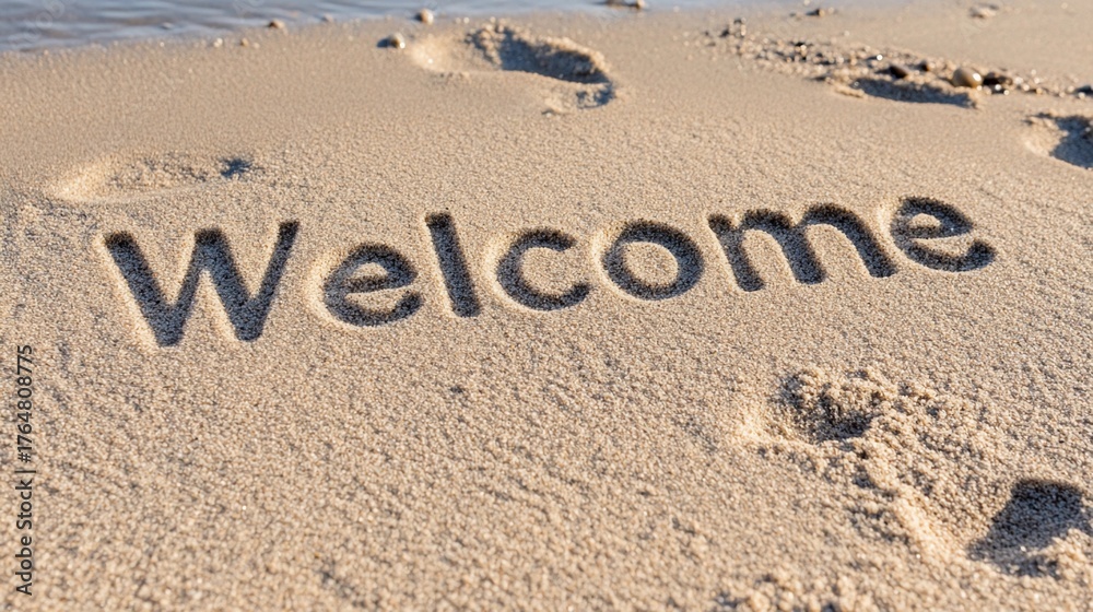 Welcome sign written in soft sand at the beach during sunny daylight with gentle waves in the background symbolizing an inviting start in a peaceful setting #1764808775