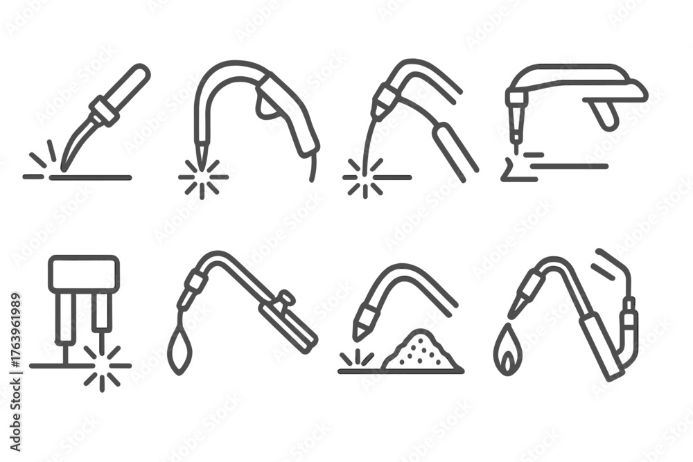 Welding Tools Icons. Line style icons of Welding methods: arc welding, MIG welding gun, TIG welding torch, plasma cutter, spot #1763961989