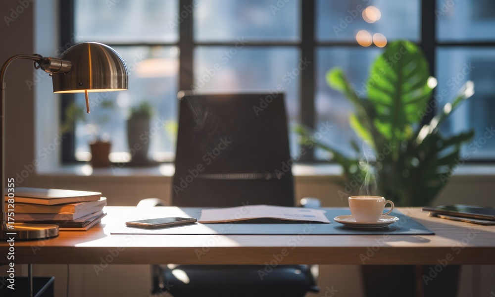 Well-lit office space with a desk, chair, and coffee cup, framed by a window #1751280355