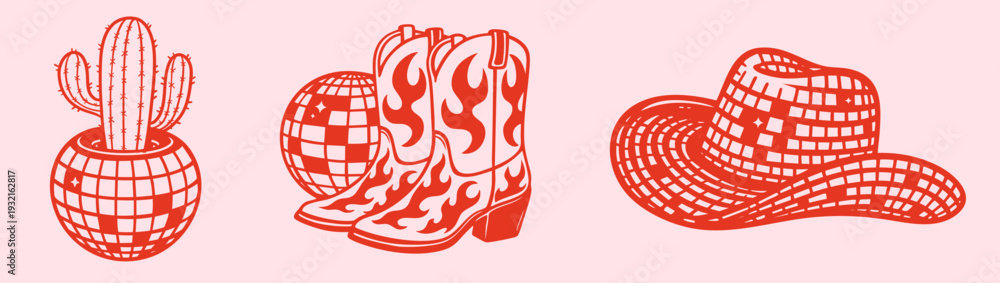 Western Disco Party, Cowboy Hat, Rodeo Boots and Cactus in Disco Ball, Retro 70s Country Glam #1932162817