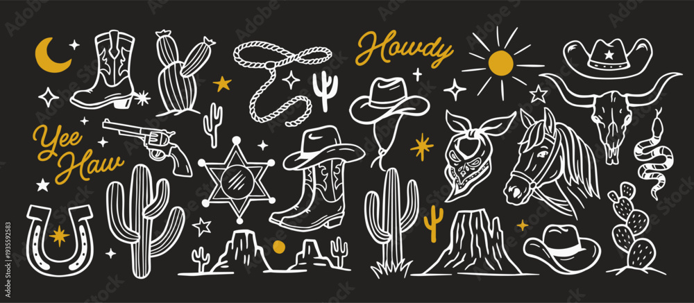 Western doodle vector set with cowboy hats, boots, cactus, horse, skull, revolver, sheriff badge, and desert elements, perfect for vintage, rustic, and Wild West designs. #1935592583