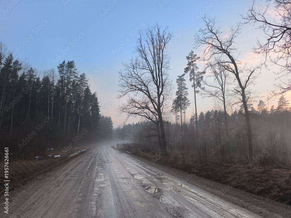wet, mud covered country road through spring forest in misty morning #1957626661