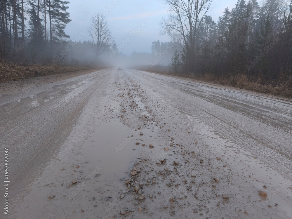 wet, mud covered country road through spring forest in misty morning #1957627037