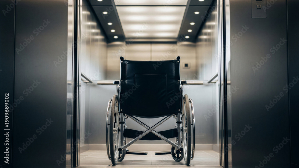 Wheelchair inside modern elevator in neutral colors representing accessibility #1909689002
