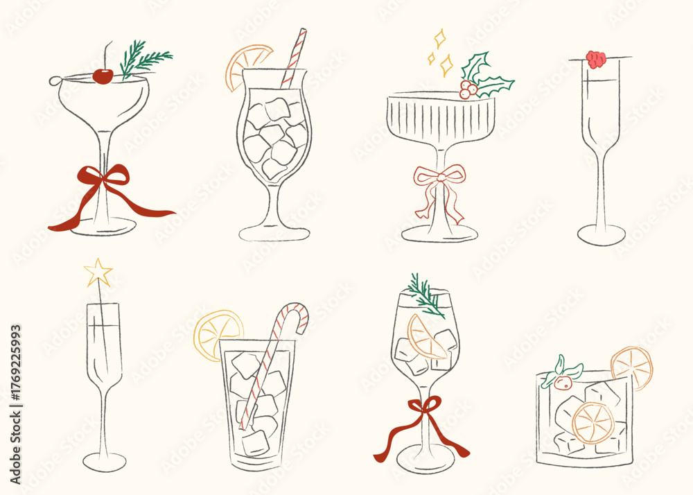 Whimsical Christmas cocktails with festive ribbons, citrus garnishes, and champagne flutes. Cozy hand-drawn drinks for holiday party and winter celebration. Vector illustration. #1769225993