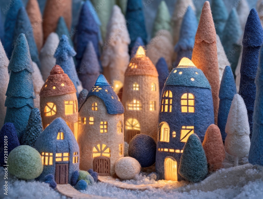 Whimsical Felt Village with Glowing Windows #1928193019
