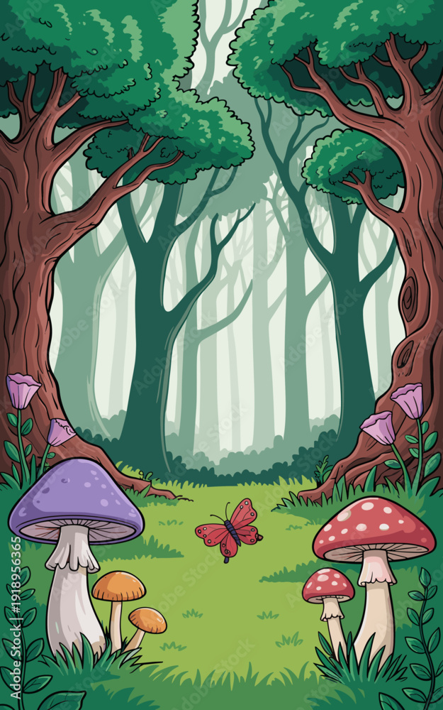 Whimsical Forest Scene: Butterfly Flitting Through Magical Woods with Colorful Mushroom Patch Illustration in Fantasy Setting for Children's Storybook, Enchanted Nature, Cartoon Style, Vector Artwork, #1918956365