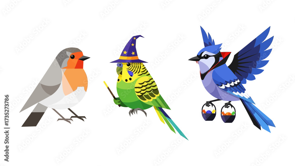 Whimsical Trio of Avian Characters: Captivating illustrations featuring three distinct bird characters - a European robin, a wizard-like parakeet. #1735273786
