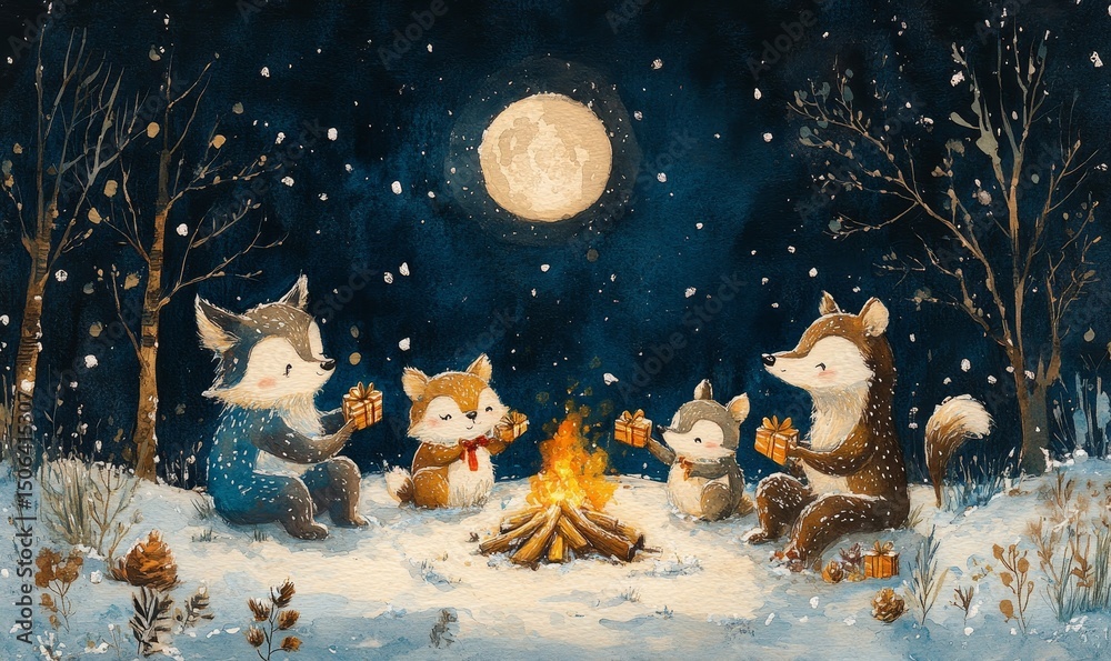 whimsical watercolor of woodland animals sharing gifts around a campfire in a snowy clearing, under a crescent moon, Generative AI #1506415307