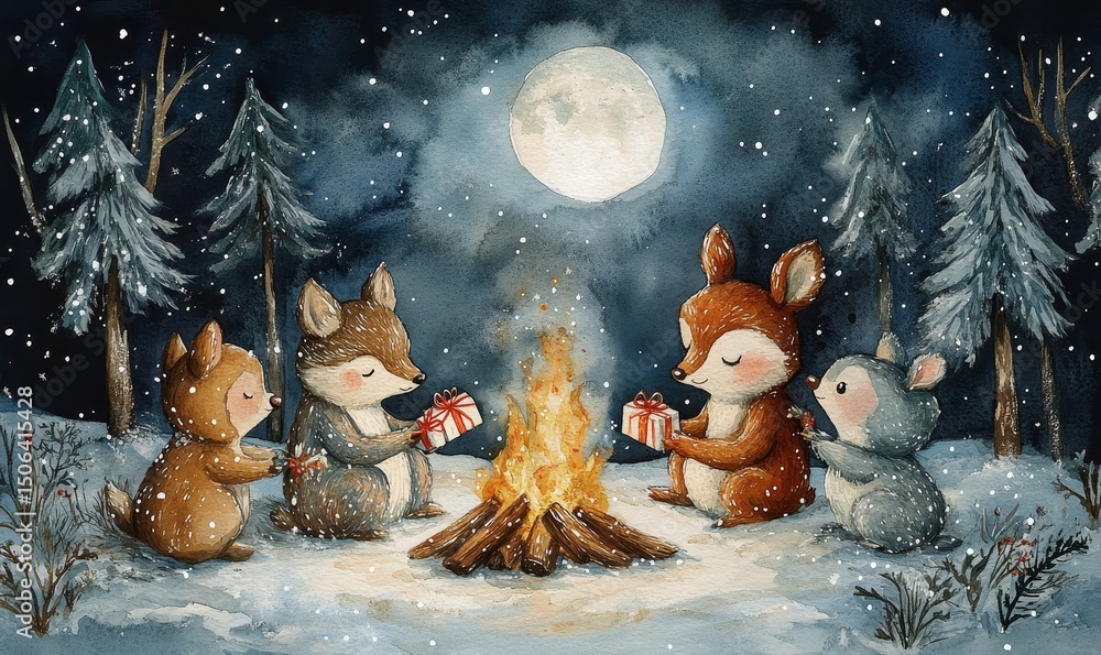 whimsical watercolor of woodland animals sharing gifts around a campfire in a snowy clearing, under a crescent moon, Generative AI #1506415428