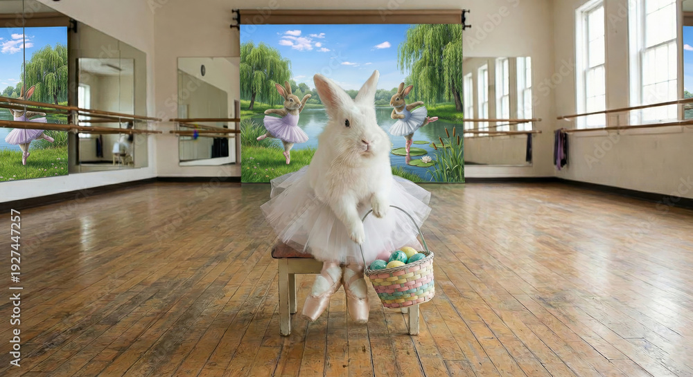 Whimsical white ballerina bunny in a tutu and pointe shoes sits in a dance studio holding an Easter basket, with a scenic backdrop of rabbits dancing by a pond. #1927447257