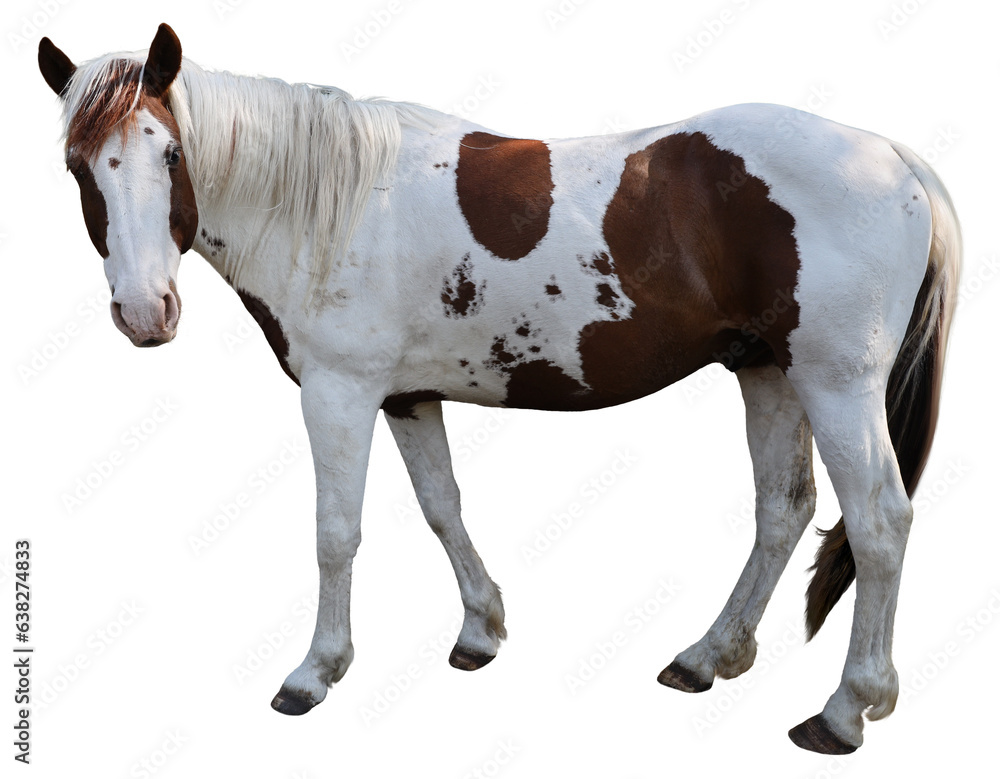 White and brown paint horse standing isolated on a transparent background. #638274833