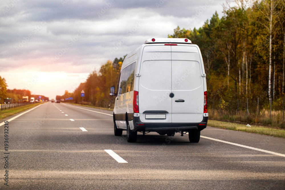 White cargo van driving on highway at sunset, autumn trees line road, delivery vehicle traveling on asphalt route during golden hour with cloudy sky #1936932215