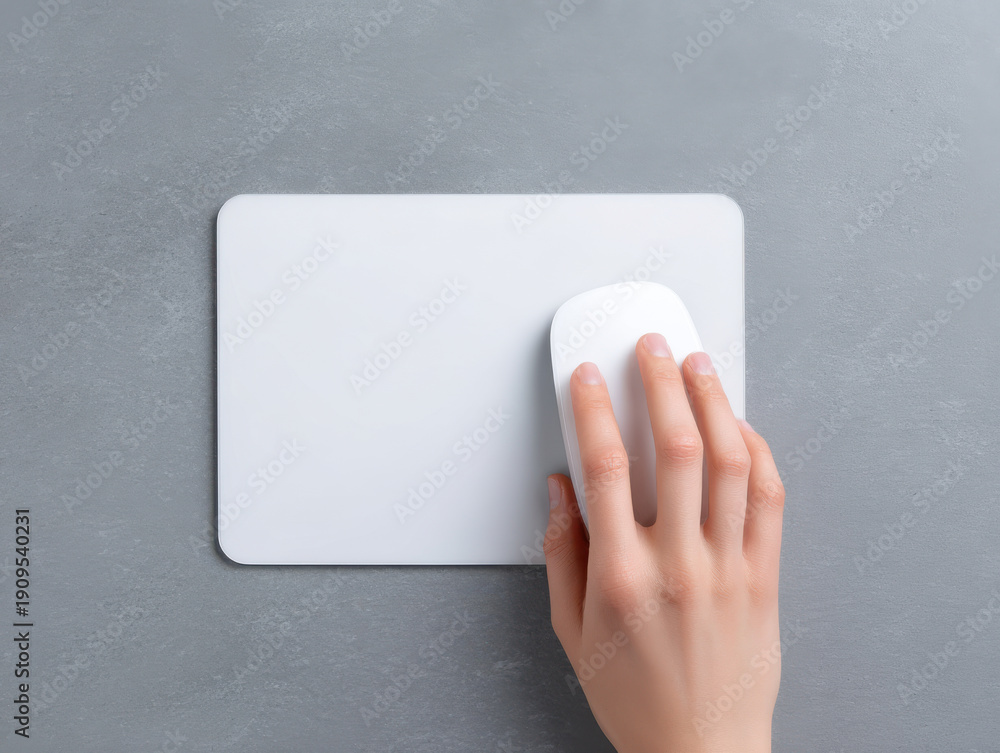 White computer mouse on blank mousepad with hand on gray textured surface, minimal workspace concept #1909540231