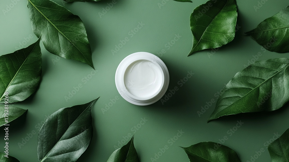 White cream jar mockup surrounded by dark green leaves for natural skincare or organic beauty branding on a sage background. #1752819268