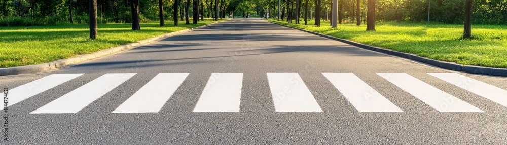 White crosswalk lines on asphalt street provide pedestrian safety and accessibility in urban environment #1144774021