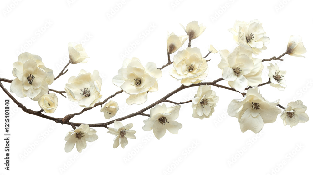 White flower branch with delicate blooms and a natural curve isolated on a white background #1215401848