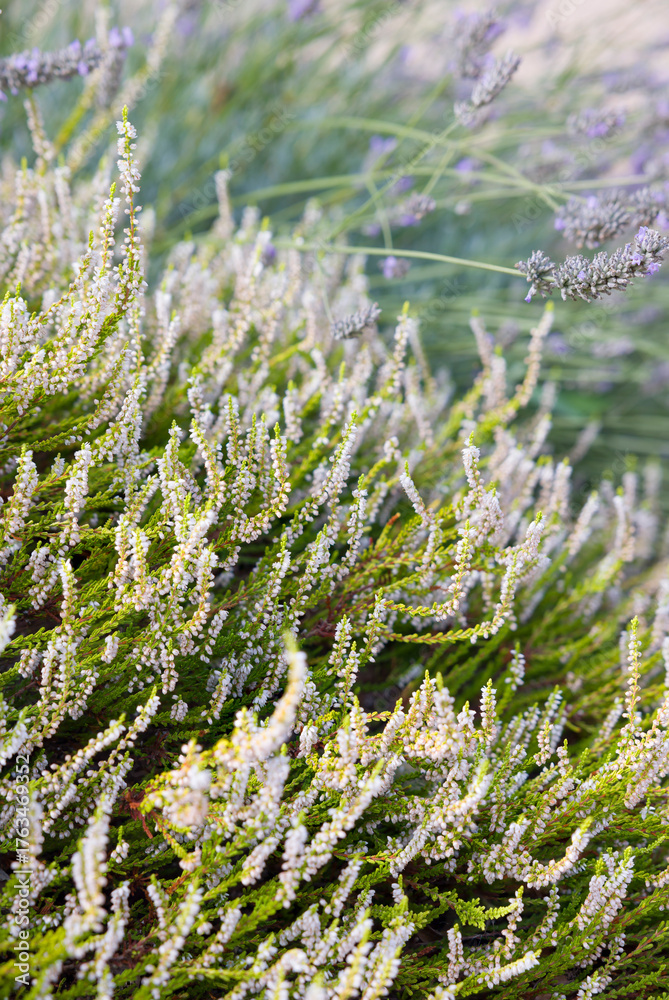 White heather flowers Calluna vulgaris (Yvettes Gold), UK #1763469352