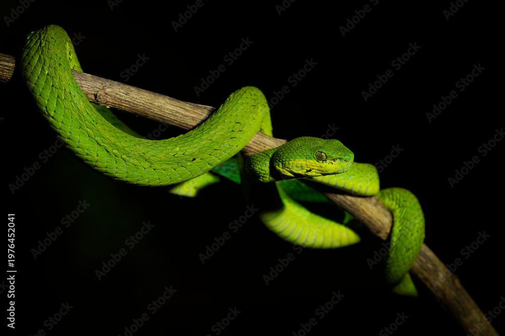 White-lipped island pitviper Trimeresurus insularis green morph coiled on branch, vivid lime-green scales, cat-eye pupils, black background, venomous arboreal snake, Flores, Indonesia #1976452041
