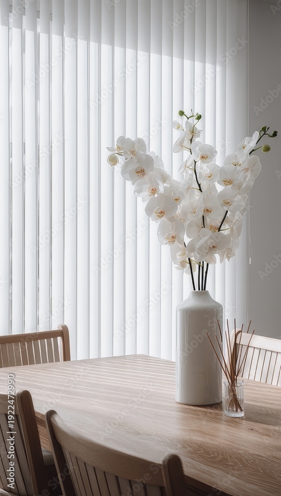 White orchid in a vase on a wooden table with sunlight streaming through blinds. Home decor, nature, and tranquility concept. #1922472990