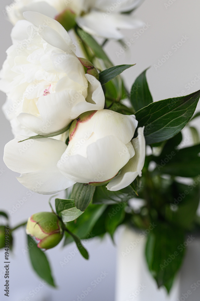 White peonies blooming, delicate petals opening, growing against a soft background, representing purity and fresh beauty #1943029387