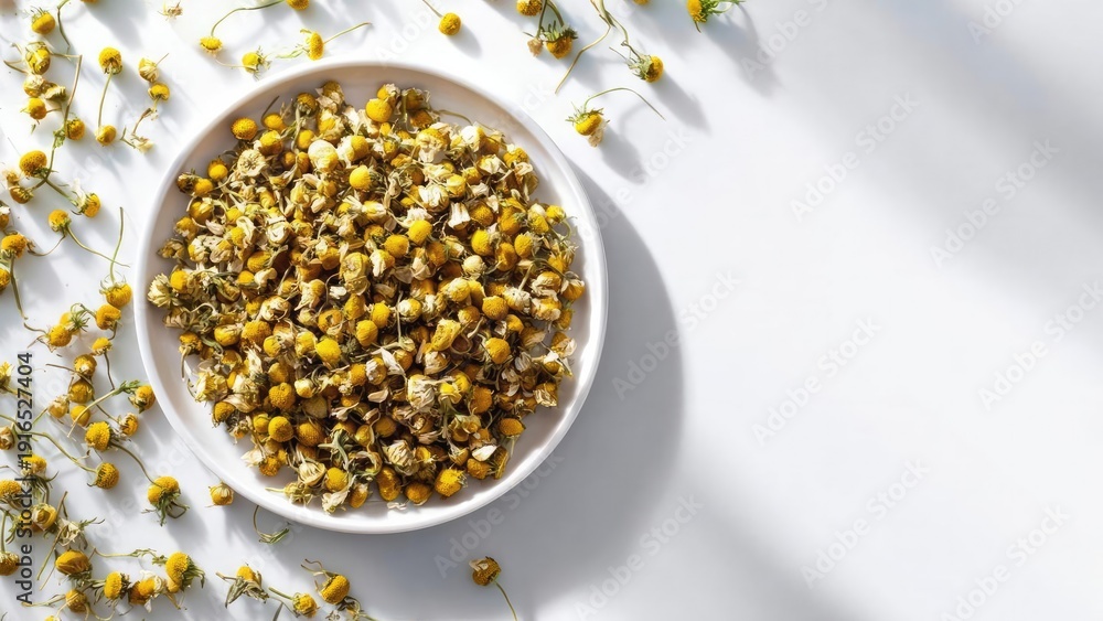 White plate filled with dried chamomile flowers, with loose yellow blossoms scattered on a pale surface. Concept Chamomile Still Life, Dried Chamomile Flowers, Soft Pastel Palette #1916527404