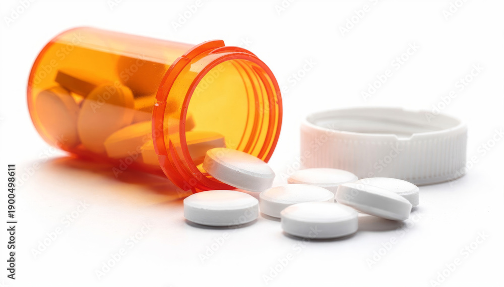 White round medication pills spill from an open orange prescription bottle. serious concept for healthcare, treatment, pharmacy and medicine #1900498611
