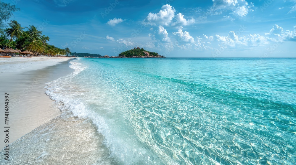 White sandy beach with crystal clear tropical sea and bright sunny sky perfect vacation scene #1941494597