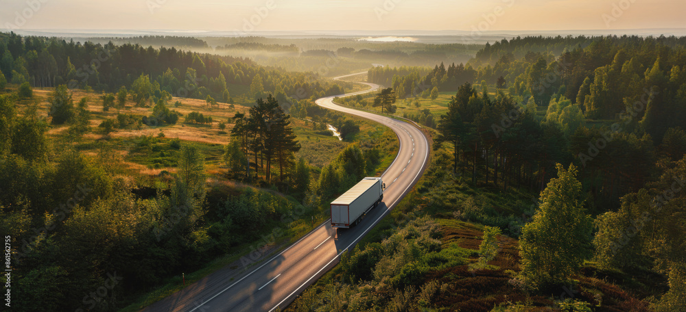 White semi-truck traveling on winding highway through forested landscape at sunrise #861562755